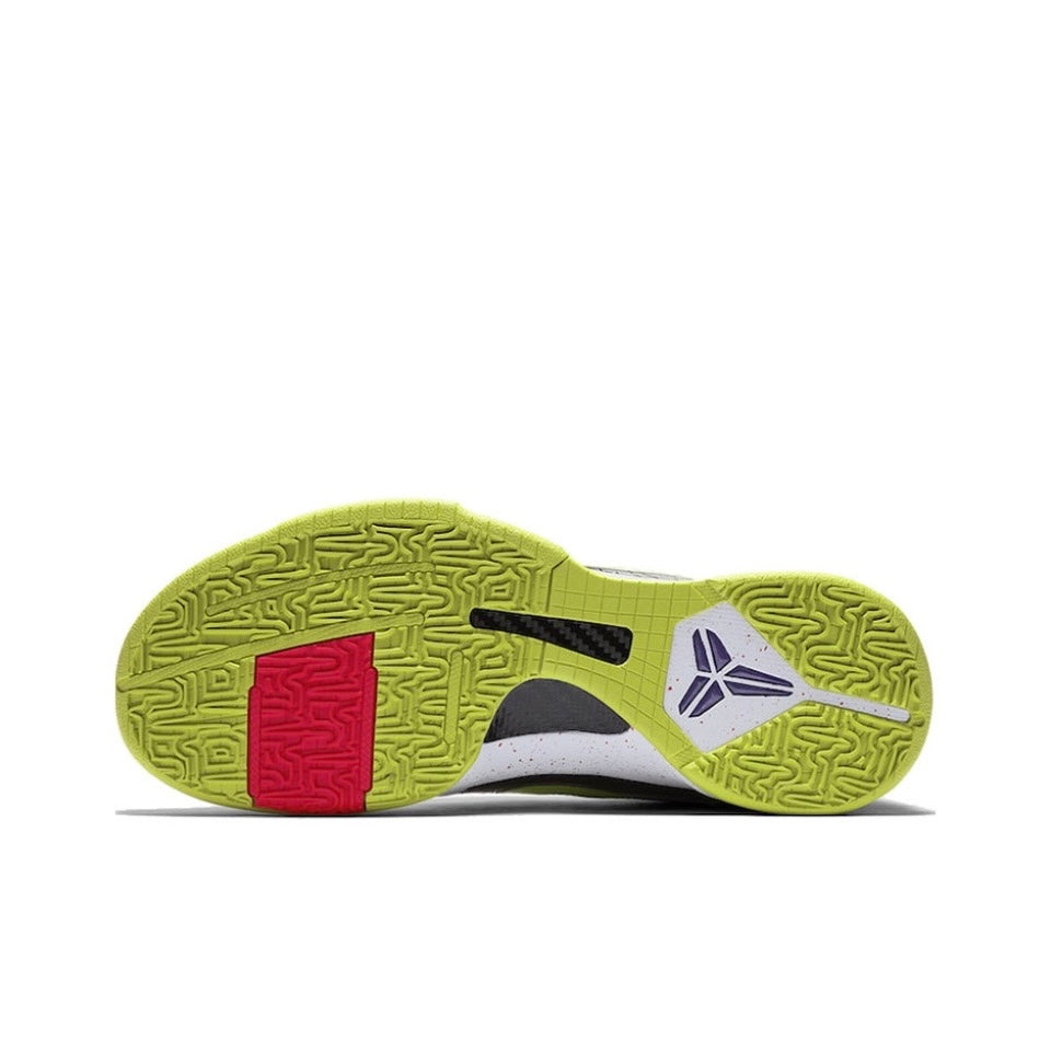 Този Kobe 5 Protro е съставен от хамелеонна горна част FlyWire с бели и въглищни наслагвания. Дизайнът се допълва от бяла междинна подметка с червени петънца, лайм зелена подметка и лайм зелен Swoosh.